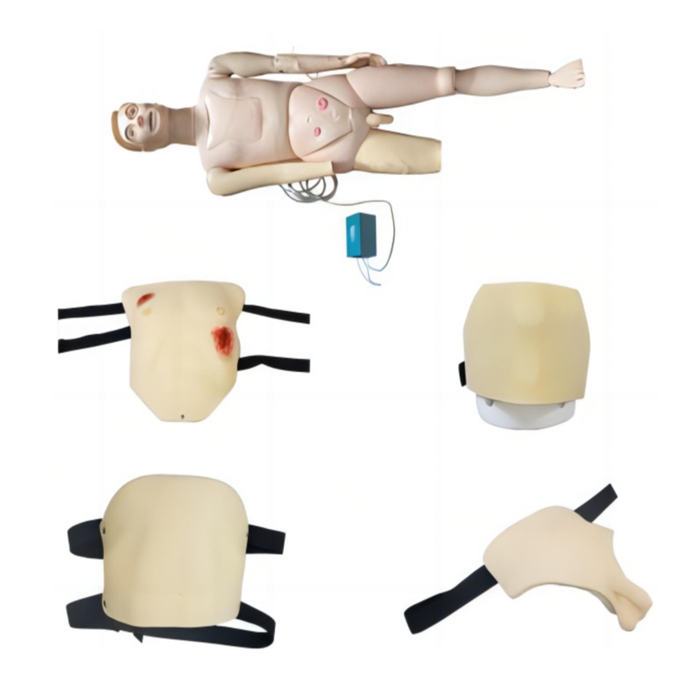 (1)本模型主體采用橡膠、硅膠等高分子復(fù)合材料,手感接近真實,皮膚柔軟富有彈性可抗撕裂??砂卜庞诖┐鞅承幕驑?biāo)準(zhǔn)化傷員衣物內(nèi),穿戴便捷、貼合度好,有真實的解剖結(jié)構(gòu),便于定位;可模擬訓(xùn)練體表出血控制術(shù)(腔隙填塞等)、包扎、血氣胸穿刺、腹腔穿刺、環(huán)甲膜穿刺/切開、導(dǎo)尿/膀胱穿刺技術(shù),進行出血控制、火器傷口包扎止血和教學(xué)演示及考核功能。