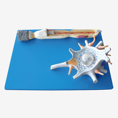 博友BM18001神經(jīng)元放大模型由神經(jīng)元胞體和神經(jīng)纖維在電子顯微鏡下的放大結(jié)構(gòu)兩個部件組成,并顯示神經(jīng)細(xì)胞軸丘、樹突、尼氏體、神經(jīng)絲、髓鞘板層、雪旺細(xì)胞、朗飛結(jié)、以及微管等結(jié)構(gòu),共有15個部位指示標(biāo)志。 尺寸:放達(dá)2500倍,高38.5cm,寬28cm,深13cm