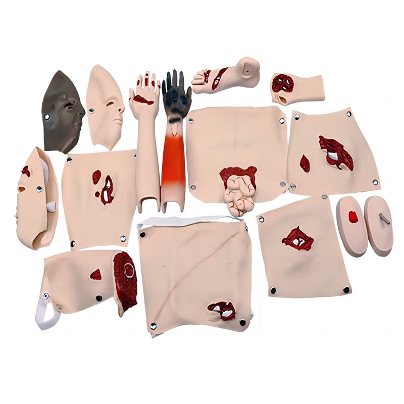 該創(chuàng)傷功能模塊呈現(xiàn)了極為多樣且逼真的創(chuàng)傷場(chǎng)景。從面部到四肢,各類傷情應(yīng)有盡有。面部涵蓋了 ⅠⅡⅢ 度燒傷以及前額撕裂傷口、頜骨創(chuàng)傷,給頭面部創(chuàng)傷救治提供模擬。身體軀干部分有鎖骨開放性骨折與胸膛挫傷、腹部創(chuàng)傷伴小腸突露,考驗(yàn)胸腹外傷處理能力。四肢更是重災(zāi)區(qū),右上臂、右手、右大腿、右小腿、右足多處出現(xiàn)開放性骨折、軟組織撕裂、槍彈傷、金屬異物刺傷等,還有左前臂燒傷、左大腿截?cái)鄤?chuàng)傷,為創(chuàng)傷急救培訓(xùn)提供了豐富素材。 創(chuàng)傷功能模塊: |