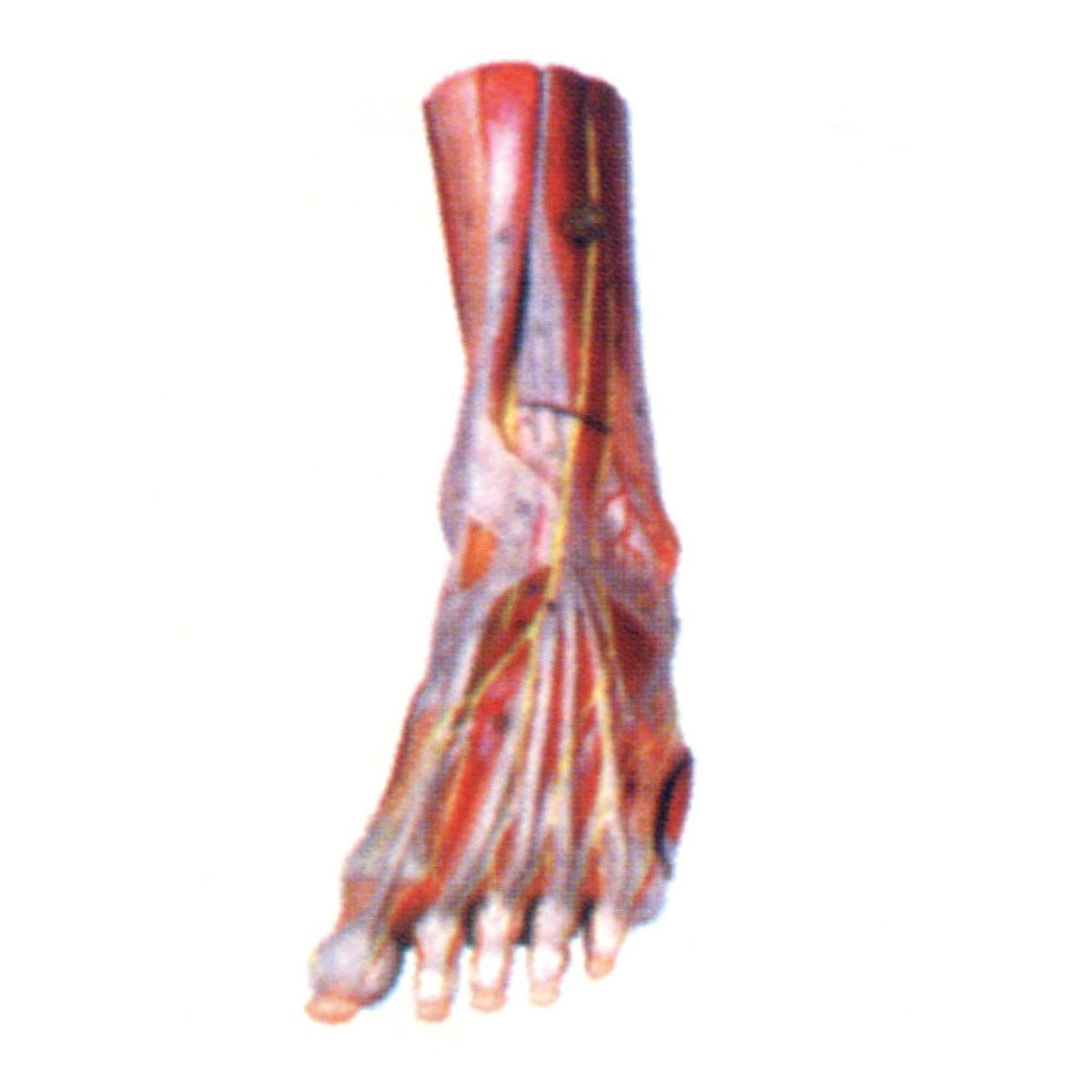 博友BM1303足肌附主要血管神經(jīng)模型由足肌、趾長伸肌、腓腸肌、屈肌支持帶、足母短屈肌、足母收肌斜頭、小趾展肌、趾短屈肌、足底方肌等9個部件組成,并顯示脛、腓骨和足骨、小腿肌、足肌等結(jié)構(gòu)。 尺寸:自然大,20×9×33cm