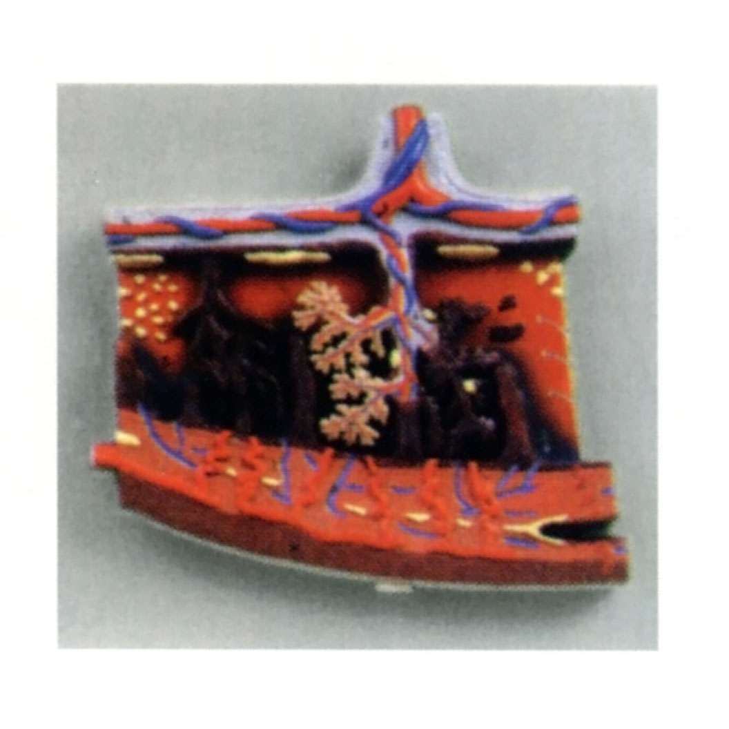 博友BM2049胎盤組織放大模型顯示胎盤組織結(jié)構(gòu)羊膜上皮、叢密絨毛膜、絨毛干、絨毛、細(xì)胞滋養(yǎng)層殼和基蛻膜以及臍帶等結(jié)構(gòu),胎兒臍血管紅色為臍靜脈,蘭色為臍動(dòng)脈,母體子宮血管,紅色為子宮螺旋動(dòng)脈,蘭色為子宮靜脈,共有14個(gè)部位指示。