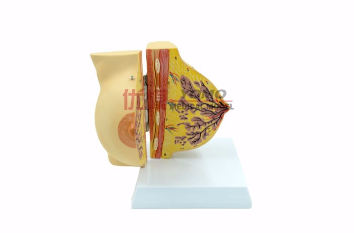 此款模型由兩個(gè)部件組成,可活動(dòng)打開,顯示靜止期女性乳房剖面結(jié)構(gòu),共有12個(gè)部位指示標(biāo)志。