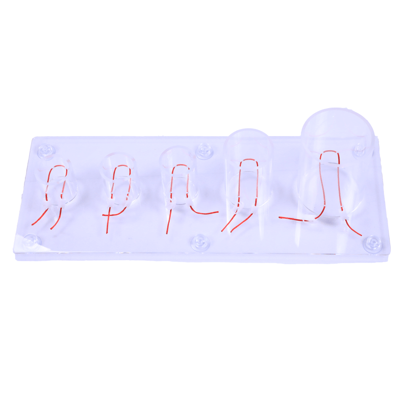 功能特點(diǎn): ■ 由透明材質(zhì)制成,五種不同大小的圓柱體構(gòu)成不同的打結(jié)空間。■ 打結(jié)方法:?jiǎn)问执蚪Y(jié)法、雙手打結(jié)法、器械打結(jié)法;■ 打結(jié)種類(lèi):?jiǎn)谓Y(jié)、方結(jié)、三重結(jié)和外科結(jié),辯論假結(jié)、滑結(jié);■ 模擬多種打結(jié)環(huán)境:如外科結(jié)小切口打結(jié),腹腔、盆腔深部打結(jié)、大切口深部有角度打結(jié)等。