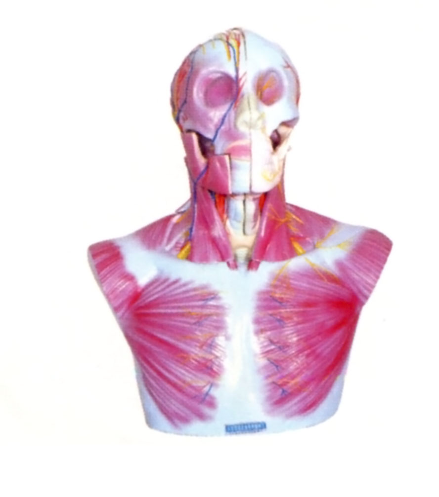 模型的頭頸部作正中矢狀切,示各器官的結構,左半側腦可拆下示腦N外形及進出腦顱底的部位;在顯示頭頸部肌肉的基礎上示深淺血管和神經(jīng)的走向分布。