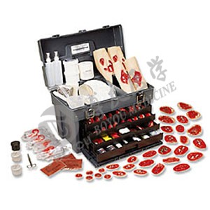 A comprehensive selection of casualty simulations including such realistic bleeding strap-on and stick-on wounds and injuries as compound extremity fractures, various burns, puncture wounds, eviscerations, lacerations, fractures, flesh wounds, fragment wounds, and foreign body protrusions. Simulation make-up, accessories, and makeup tools are provided for staging "victims" to appear to be in shock or pain, traumatized, lacerated, burned, bleeding, and/or dirty. Bleeding wounds have plastic reservoir pump assemblies to ensure a continuous lifelike flow of simulated blood. All components come in a carrying case with drawers and compartments (22" x 13" x 15").