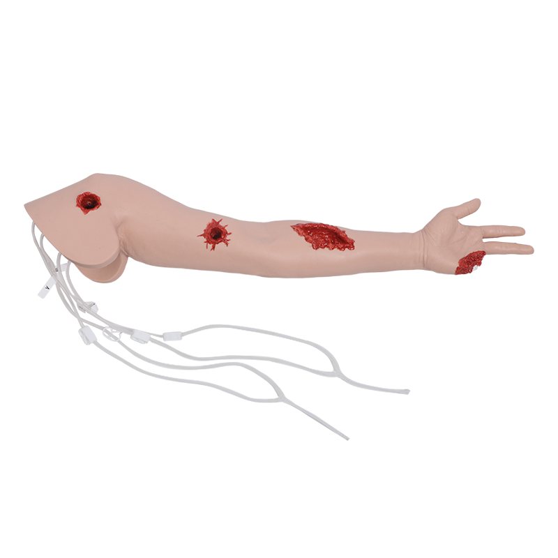 這是一款專為醫(yī)療培訓(xùn)、急救演練設(shè)計的仿真手臂模型,高度模擬真實創(chuàng)傷場景,適用于止血技術(shù)練習(xí)、傷口處理教學(xué)等專業(yè)領(lǐng)域。產(chǎn)品可模擬槍傷、刀傷、撕裂傷等多種傷口類型,并支持模擬出血功能,提升訓(xùn)練的真實性。